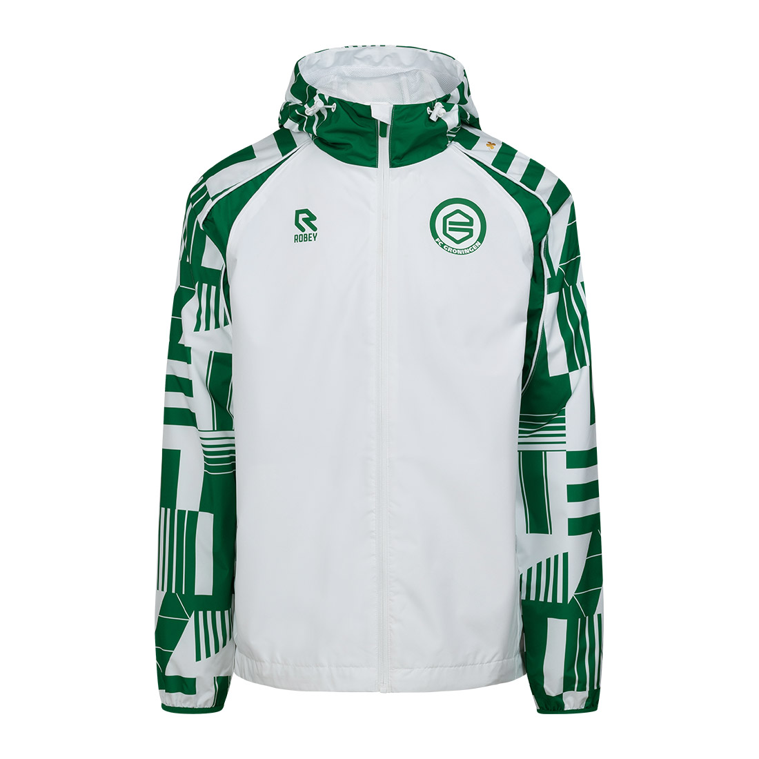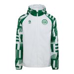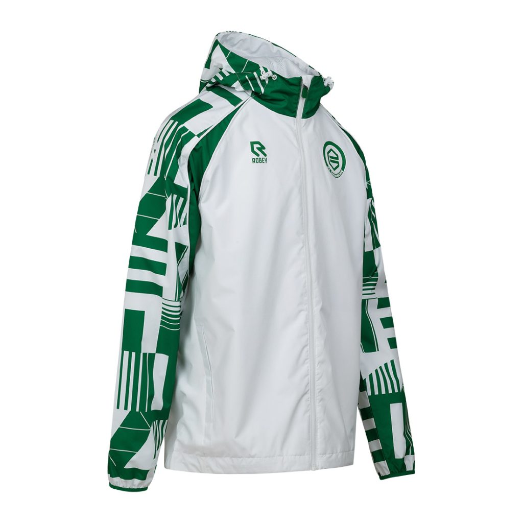 Kom in groen-wit naar het stadion met dit jack! Deze jas is licht van gewicht, waterafstotend en ideaal voor alle weersomstandigheden. Daarnaast is deze voorzien van een capuchon en ademend materiaal, waardoor je altijd comfortabel bent, zowel onderweg als in het stadion. Deze is ideaal te combineren met het warming-up shirt van dit seizoen.